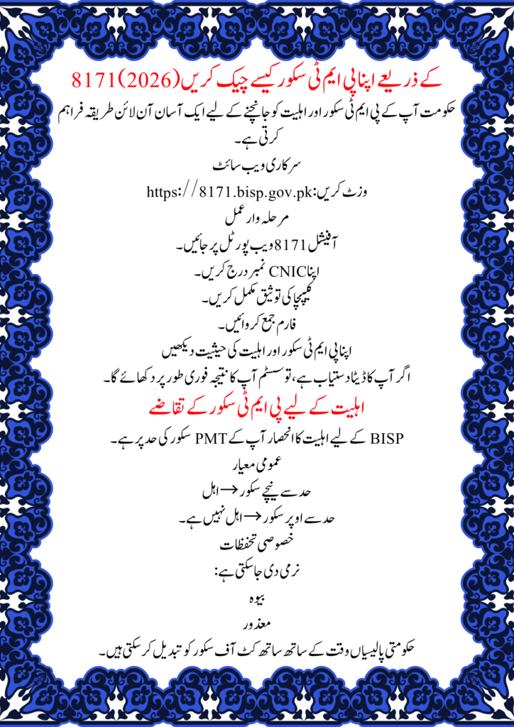 The Benazir Income Support Program (BISP) uses a Poverty Means Test (PMT) score to determine which families qualify for financial assistance. In 2026, the 8171 system makes it simple for applicants to check their PMT score and eligibility status online.