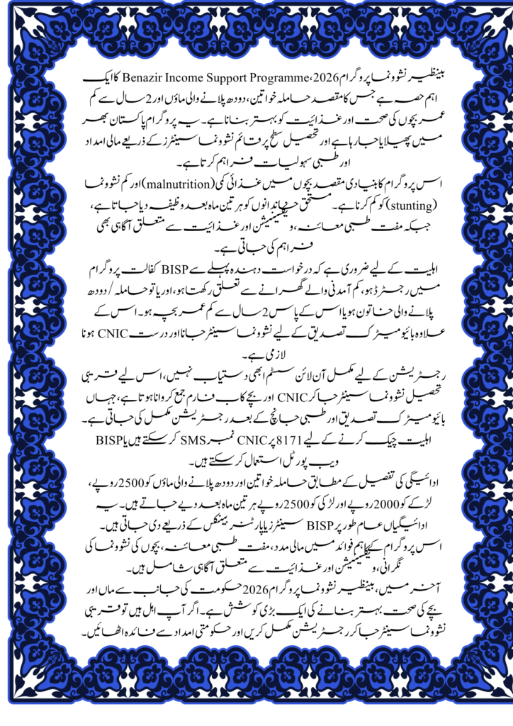 The Benazir Nashonuma Program is a vital initiative under the Benazir Income Support Programme aimed at improving the health and nutrition of pregnant women, lactating mothers, and children under 2 years of age. In 2026, the program continues to expand across Pakistan, offering financial assistance and health support through Nashonuma Centers at the tehsil level.