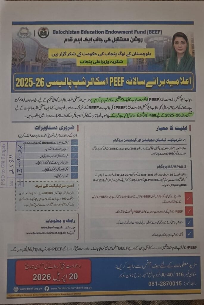 The Balochistan Education Endowment Fund (BEEF) has announced its annual scholarship program for the academic year 2025–26 under the PEEF Scholarship Policy. This initiative aims to support talented and deserving students of Balochistan in continuing their education.